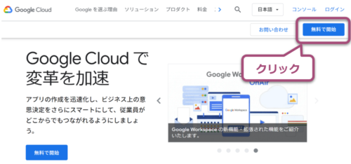 Google Cloud Platform(GCP)のWebサイトを開き「無料で開始」のボタンをクリックします。