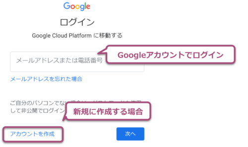 Googleアカウントでログインします。新規にGoogleアカウントを作成する場合は「アカウントの作成」リンクをクリックします。