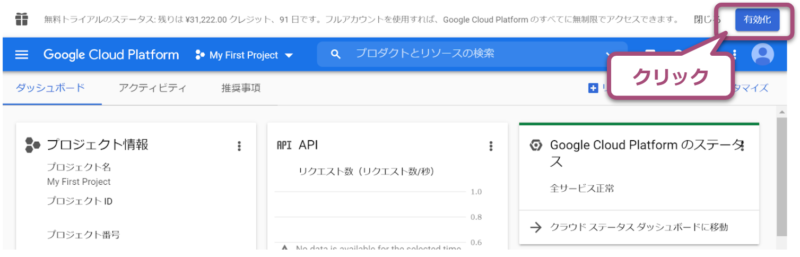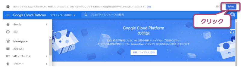 既にGoogleアカウントにログインしていた場合に自動でGCPのコンソールが表示される場合があります。その場合は、画面上部の「有効化」をクリックします(無料トライアルの開始)