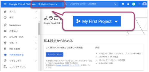 GCPアカウントの登録が完了した後、GCPにログインします。プロジェクトとして「My First Project」のプロジェクトが作成されていることを確認します(自動作成)。