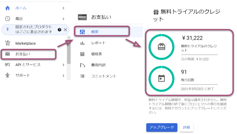 メニューの「お支払い」から「概要」を選択します。右側の「無料トライアルのクレジット」を確認します。無料の残金額と無料トライアルの残日数が表示されます。