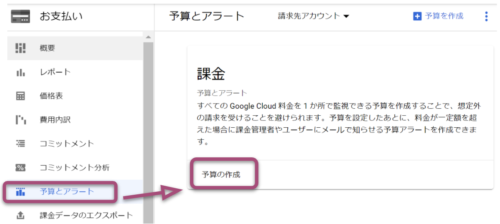 メニューのお支払いから「予算とアラート」を選択し、「予算の作成」をクリックします。
