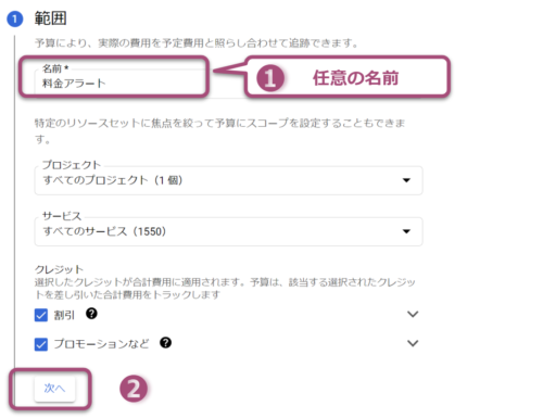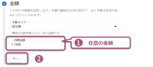 予算となる金額(任意)を設定し「次へ」をクリックします。