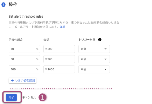 メール通知を行う金額を確認し「終了」をクリックします。金額には初期値(50%の時点、90%の時点、100%の時点)が入力されています。必要に応じて変更します。
