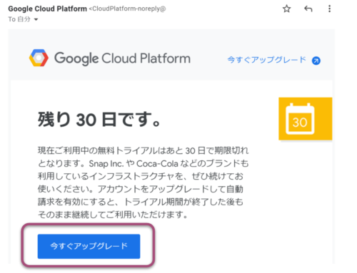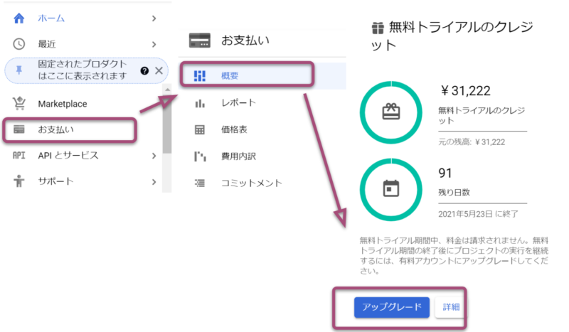 ※残金額を無料トライアル経過後にも利用する場合はアップグレードを行う必要があります。